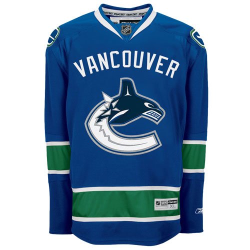 Vancouver Canucks Reebok Premier Home NHL Hockey Jersey Vancouver Canucks NHLPA Certified! NHL RBK Premier Hockey jersey by Reebok. The new NHL RBK Premier Hockey Jersey by Reebok is made of high-quality polyester two-way stretch fabric. This officially licensed RBK jersey is engineered to duplicate the on-ice team Reebok jersey and has the following features: Polyester interlock knit rib collar. Solid mesh inserts for ventilation. The front team crest is embroidered just like the authentic NHL jersey and the single layer screen printed tackle twill shoulder patches (where applicable) are sewn directly to the Reebok jersey. NHL/RBK neck label and woven jock tag with alpha sizing sewn on to the front of the hockey jersey (lower, left side). NHL Shield patch sewn into the front collar. List price: $134.99 Buy from amazon.com